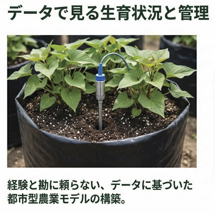 さつま芋や落花生を栽培する袋に、環境センサーを設置し街のリアルな環境情報を収集分析します。街の今どこが暑い?乾燥している?、など数メートル単位で作物を育てながら知ることができます。